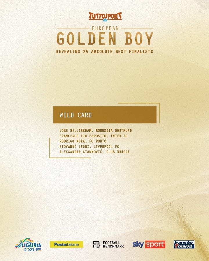 库巴西(巴塞罗那)、杜埃(巴黎圣日耳曼)、赫伊森(皇家马德里)、伊尔迪兹(尤文图斯)、斯凯利(阿森纳)、埃梅里(巴黎圣日耳曼)、居莱尔(皇家马德里)、马斯坦托诺(皇家马德里)、恩瓦内里(阿森纳)、哈托(切尔西)、昆达(葡萄牙体育)、埃斯特旺(切尔西)、约罗(曼彻斯特联)、马尤卢(巴黎圣日耳曼)、奥赖利(曼彻斯特城)、本-塞吉尔(勒沃库森)、弗罗霍尔特(波尔图)、贝里瓦尔(热刺)、格雷(热刺)、萨尔(斯特拉斯堡)、小贝林厄姆(多特蒙德)、埃斯波西托(国际米兰)、罗德里戈-莫拉(波尔图)、莱奥尼(利物浦)、斯坦科维奇(布鲁日)